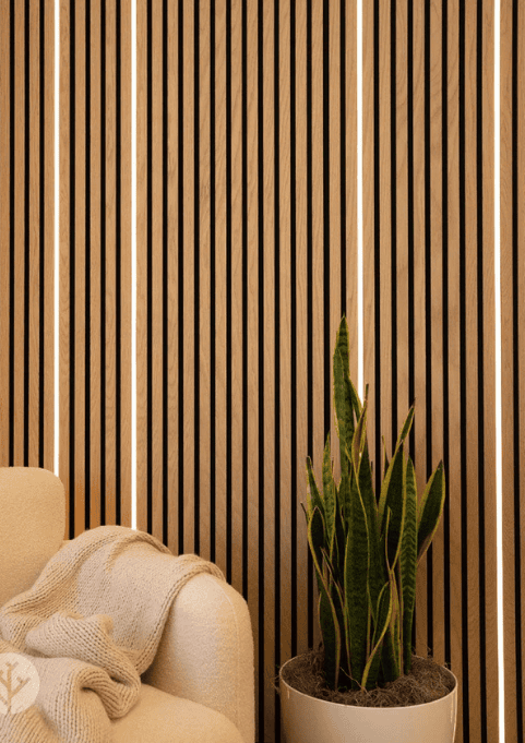 Medusa Slat is built to install inside 13 mm (0.51 in) and 15 mm (0.59 in) acoustic slat grooves, creating a light line that becomes part of the panel. When off, it disappears as a black reveal; when on, it delivers a precise architectural glow.