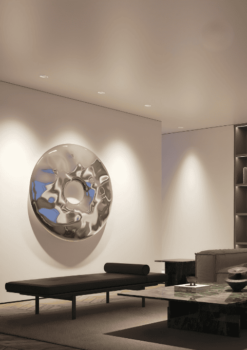 The ultra-thin trim sits flush with the ceiling, blending effortlessly into the architecture for a discreet, refined look.