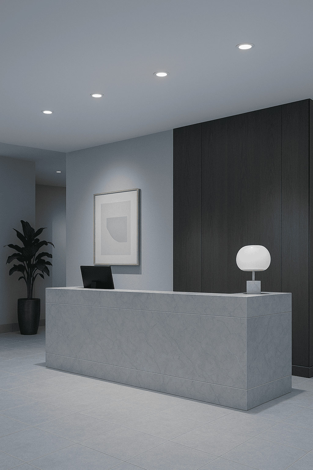A deep-set chamber and matte finishes minimize glare, combining performance with elegant, minimal detailing.